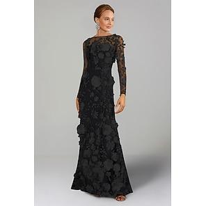 Zwart Bloem Borduurwerk Applique Strand Bruids Gast Jurken Formele Semi-formele Sheath Kolom Crew Nek Lange Mouw Vloer Lengte Tule Bruidsjurken