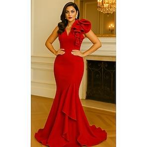 Rood Zwart Zeemeermin Trompet Avondjurk Elegante Formele Dress Formele Bruiloft Vloerlengte Mouwloos V Hals Stretch Crepe met Volants