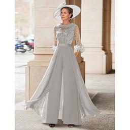 Buksedrakt Gulvlengde Halvlange ermer Besmykket Elegant Årgang Bryllupsgjest Kirke Chiffon Kjole til brudens mor med Fjær Paljett Appliqué