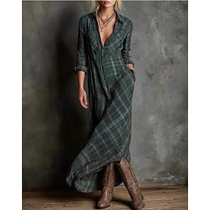 Dame Maxikjole Skiftkjole Ferie Fritid Bohem Daglig Ferie Ut på byen Normal Ruter Langermet Knaphul Dyp Grønn Høst Vinter