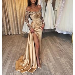 Havfrue Katedralen Train Ballkjoler Sexy Høy splittelse Ermeløs Løse skuldre Bryllupsgjest Ferie Brudepike kjole Sateng med Bølgemønster Spalte