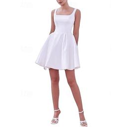 Engagemang små examensvita klänningar bröllopsklänningar A-linje fyrkantig hals utan ärm kort mini satin brudklänningar med veck