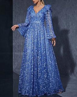 A-Linje Blå Klänningar Broderad Spets Klänning Bröllop Bröllopsgäst Långärmad V-Hals Med Ruffles
