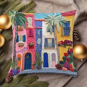 Medelhavsstil örngott med 2D-platttryck enkelsidig färgglad stadsscen växter och blommor dekorativt kuddfodral för soffa vardagsrum hem