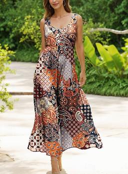 Dam Maxiklänning Solklänning A linjeklänning Slipklänning Plisserad klänning Semester Ledigt Boho Strand Normal Grafisk Årgång Bohemisk Ärmlös U-hals Rundhals Rubinrött Blå Purpur Orange Sommar Vår