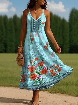Dam Maxiklänning A linjeklänning Slipklänning Semester Ledigt Boho Utekväll Normal Blommig Grafisk Ärmlös V-hals Smala axelband Blå Sommar Vår