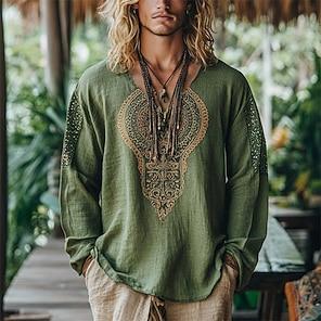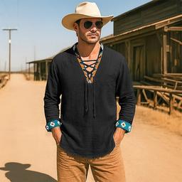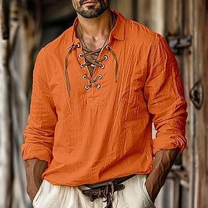 Herr Skjorta Linneskjorta Viking stil Sommarskjorta Strandskjorta Västerländsk skjorta Ensfärgat Semester Ledigt Svart Vit Grön Långärmad V-hals Kläder Snörning