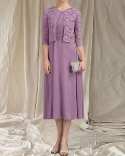 Två Delad A-Linje Mor till bruden Klänning Bröllopsgäst Elegant Crew Neck Te Längd Chiffong Spets 3/4 Längd Ärme med Spets Rynkad Midi Klänning