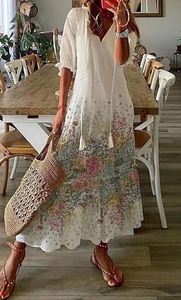 Dam Långklänning Maxiklänning Vit klänning Linne Klänning Boho-klänning Klänning med tryck Romantisk Klassisk Elegant klänning Puffärm Semester Dagligen Helgdag Lös passning Grafisk Blomma Halvlång