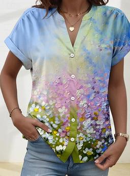 Dam skjorta blommig grafisk stilren strand kort ärm skjortkrage vanlig topp daglig knappar tryck blå vår höst