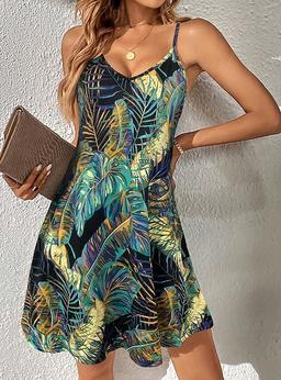 Dam Mini klänning A linjeklänning Slipklänning Off Shoulder Klänning Semester Ledigt Semester Dagligen Normal Grafisk Löv Ärmlös V-hals Mörkgrön Purpur Grön Sommar