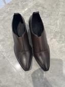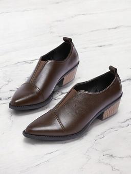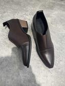 bruna slip-on ankelskor i konstläder med låg blockklack – bekväma och snygga kontorsskor för kvinnor