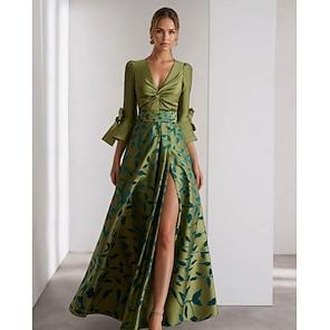 A-linje Golvlång Kvälls klänningar Balklänning Formell klädsel Elegant Vintage Kortärmad V-hals Bröllop Formell Ficka Satäng med Blomtryck
