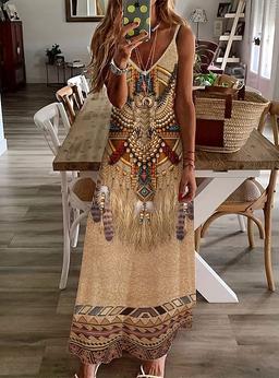 Dam Midiklänning Solklänning A linjeklänning Slipklänning Semester Ledigt Boho Utekväll Strand Lös passning Grafisk Stam Ärmlös V-hals Smala axelband Brun Sommar Vår