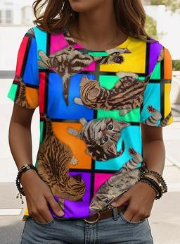 Dam T-shirt Grafisk Geometrisk Katt Vintage Stylish Modern Kortärmad Rund hals Vanliga toppar Dagligen Mönster Regnbåge Sommar