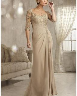 Havfrue gyllene klänning kvällsklänning elegant klänning förlovning formal kväll golvlängd 3/4-lång ärm V-hals höstbröllopsgäst chiffong med veckade rynkade klänning till att imponera
